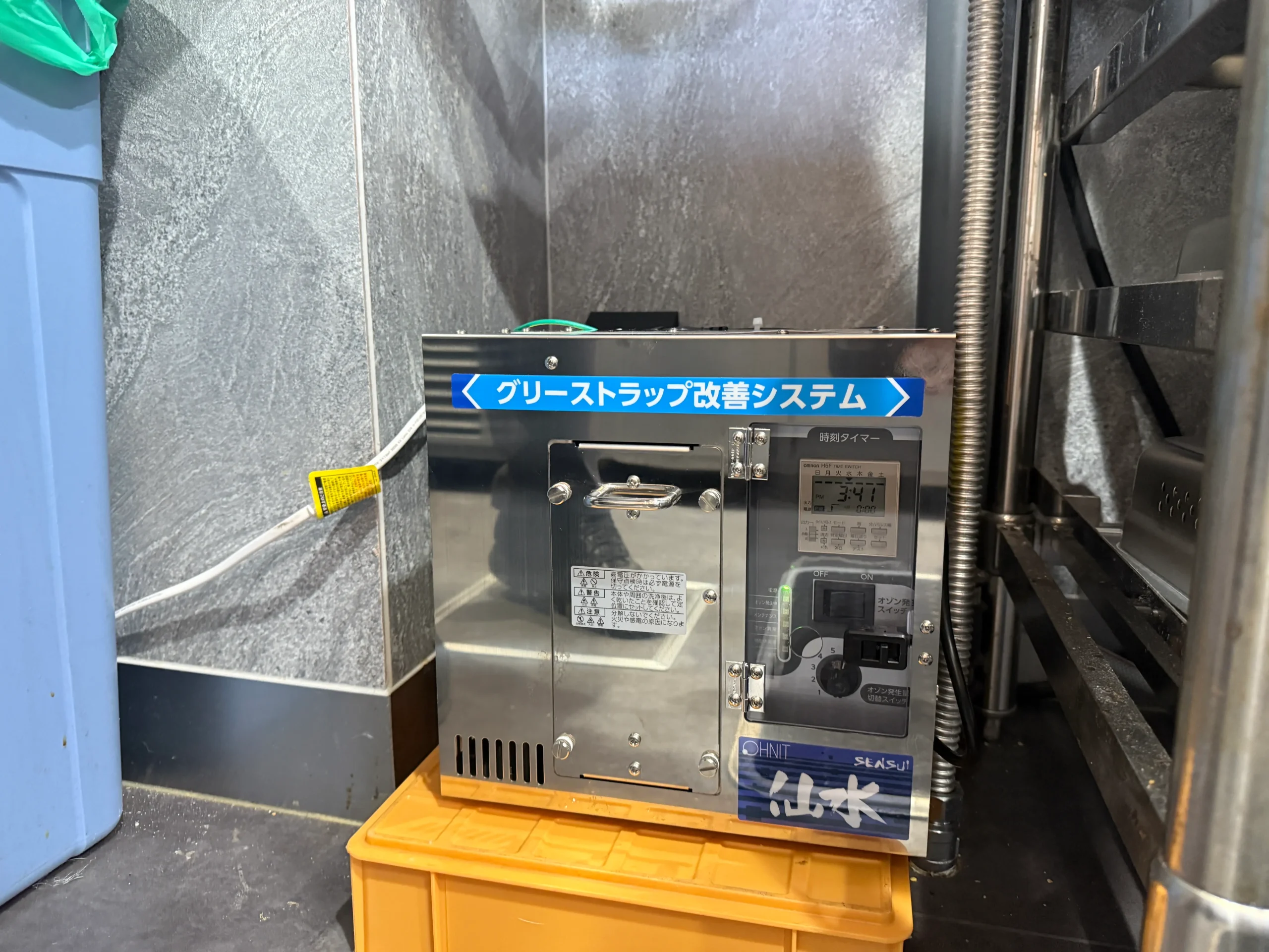 グリーストラップの清掃が大変で…。 仙水デモ設置でオゾンの効果を実感。 清掃負担軽減へ。