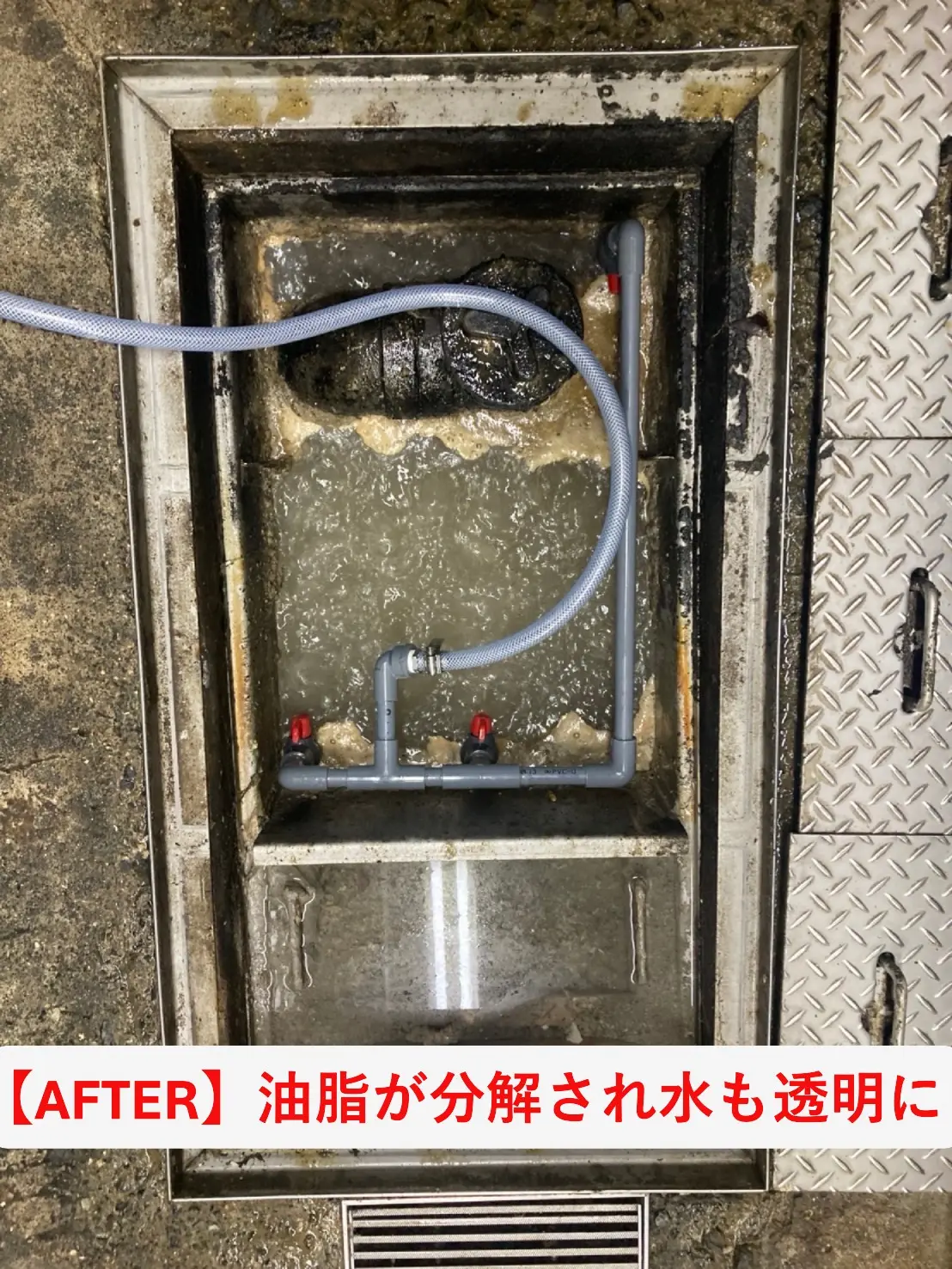 グリーストラップの悪臭とハエの発生。 デモで臭い問題解決&油脂分解も良好。 清掃作業が楽になって助かってます!